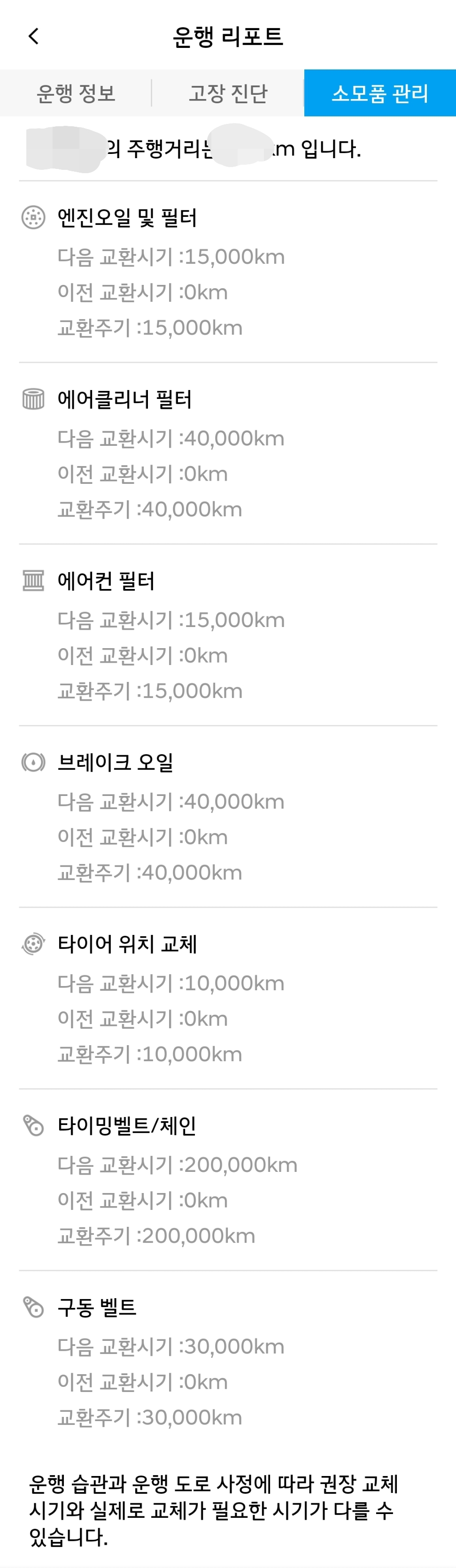 소모품 관리에서는 전체 주행거리가 나오고 언제 소모품들을 교체하면 되는지 알려주는데